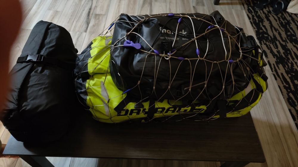 Nach dem Frühstück habe ich Simone meine Logik beim Sachenpacken und Verstauen gezeigt. Anschließend die 60-Liter Zelttasche und den 30-Liter Rucksack mit einem Stahlseilnetz gesichert. - Nicht lachen! Das ist wichtig, denn es geht nach Mexiko! - Dieser „Faden“ ist im Prinzip so, wie ein Bowdenzug, bloß als Netz.