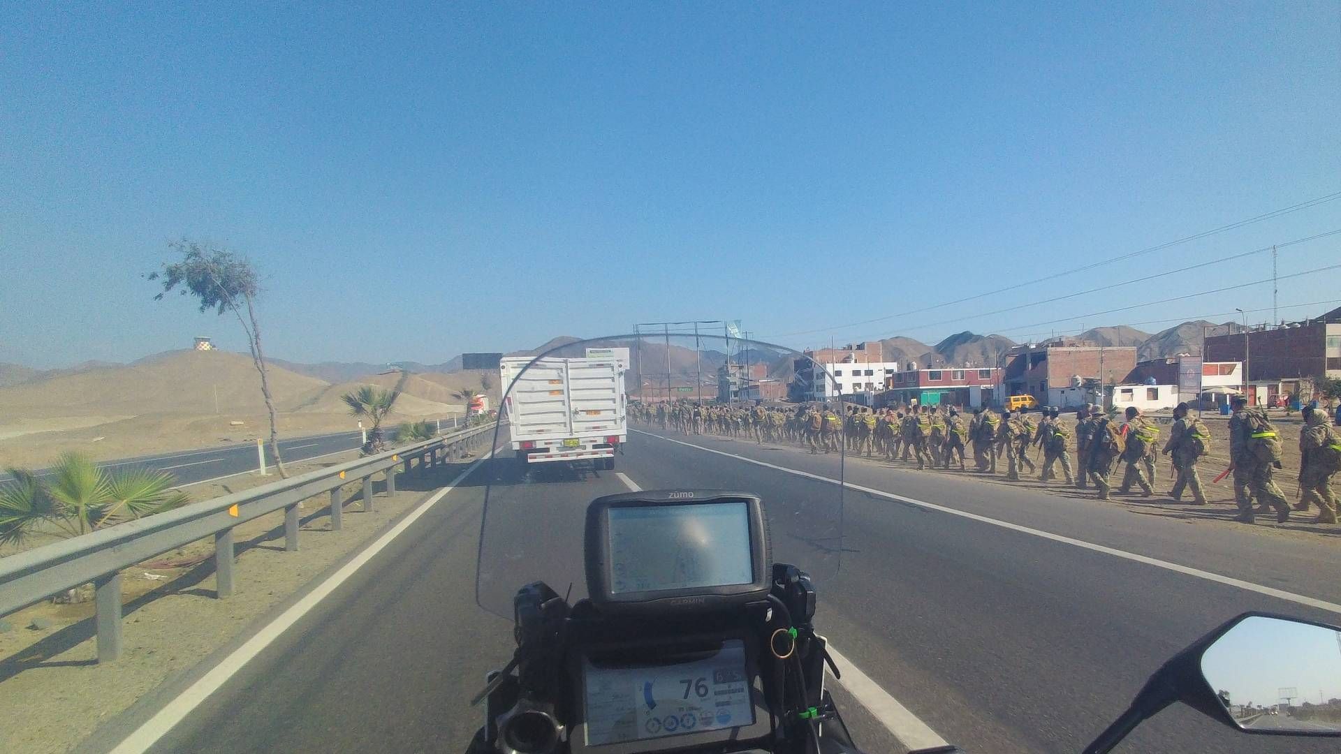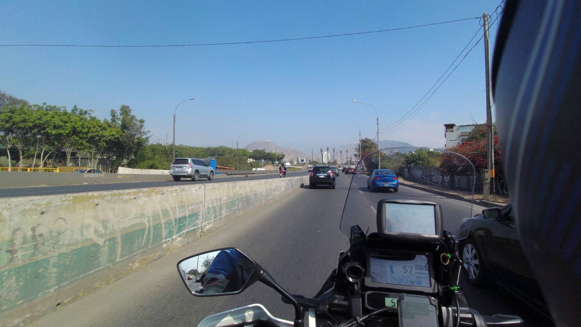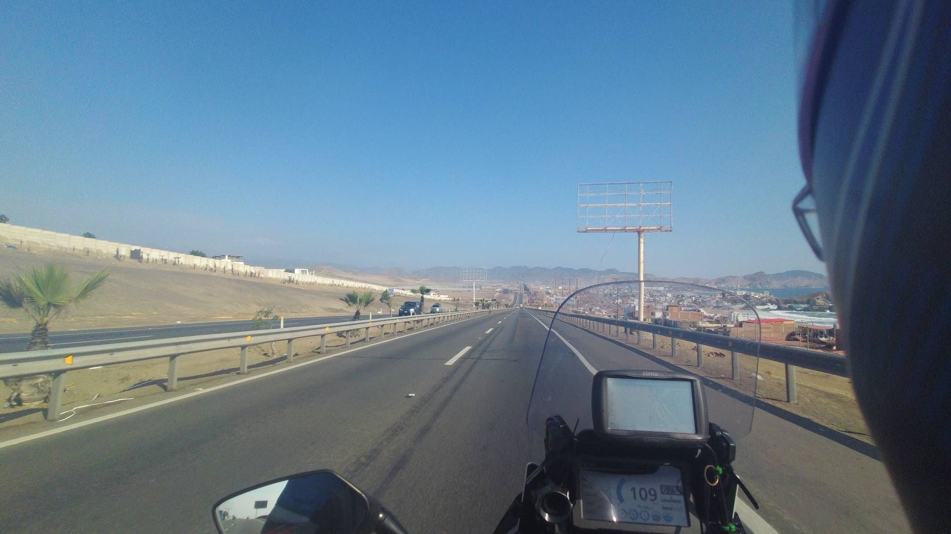 Ich war doch tatsächlich schon um 14:45 Uhr auf dem Weg nach Pisco. Jetzt musste ich aber erst einmal Lima nach Süden verlassen. Das dauerte ca. 30 Minuten und dann war auch wieder Platz auf der Straße. Diese heißt nun „Panamericana Sur“ und führt überwiegend an der Pazifikküste entlang bis nach Chile. Da hat man ordentlich Seitenwind!